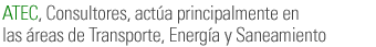 En Transporte ATEC se desempeña en planificación de proyectos urbanos y de sistemas nacionales de autopistas, caminos, ferrocarriles y en redes de metropolitanos. En Energía lo hace en generación térmica e hidráulica, transmisión en alta tensión, distribución y en procesos de racionalización. Los proyectos ejecutados incluyen tareas vinculadas a Ingeniería Civil, Eléctrica, Saneamiento y Sistemas.